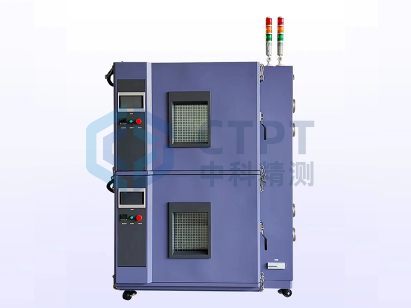 每腔均并联有2个烟雾感应系统,可在箱体内产生烟雾时迅速声光报警。由于箱体内部高低温循环易损烟感器,所以,将烟感器安装在箱体外部,用一微型气泵,时刻将箱体内部的空气泵入烟感器中,可避免烟感器的损坏。同时,烟感系统与设备联动,烟感报警时,环境箱停止运行,此时鼓风机启动,将烟雾迅速排出