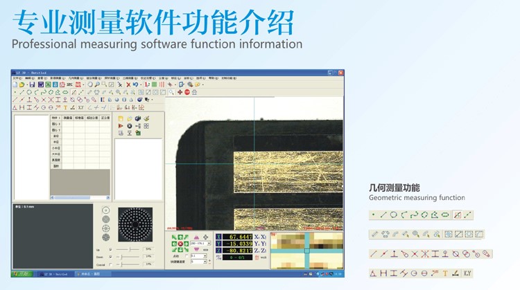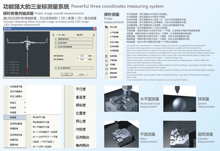1,完整的几何尺寸(点、线、面、圆、球、圆柱、弧、圆锥)、形位公差(直线度、平面度、真圆度、真球度、圆柱度、位置度、平行度、垂直度)测量功能。